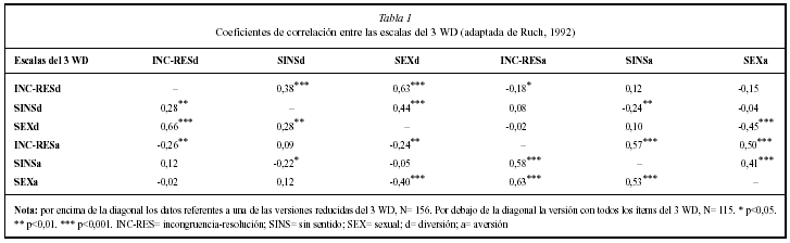 Ruch (1992) afirma, y con referencia a las posibles respuestas de humor, que la apreciación del humor puede ser definida a través de dos dimensiones ortogonales que recogerían las respuestas de valencia positiva (funniness: grado de diversión) y negativa (aversiveness: grado de aversión), y que son las que aparecen en su propuesta de escala, la 3 WD. Sobre este planteamiento, un aspecto central es analizar la relación entre dichas dimensiones de respuesta (véase tabla 1).