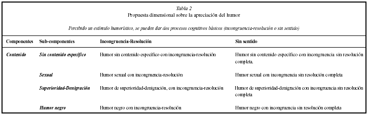 Tal y como ya se ha comentado, los resultados disponibles sobre la apreciación del humor están fundamentalmente basados en las investigaciones del grupo de Ruch llevadas a cabo con el 3 WD Humor Test, 3 WD (Ruch, 1992, 1995; Ruch y Hehl, 1998). A través de los distintos trabajos de este grupo, se obtuvo una propuesta dimensional sobre la apreciación del humor de tres factores, de los cuales dos de ellos no podían ser definidos por su contenido ya que podían referirse a diversos tópicos. Éstos fueron etiquetados como incongruencia-resolución (INC-RES) y sin sentido (SINS), y fueron denominados por Ruch como componentes estructurales o cognitivos de la apreciación del humor (teniendo su referente teórico en las teorías de la incongruencia). El tercer factor, humor sexual (SEX), recogía chistes que igualmente producían un proceso de incongruencia-resolución o bien sin sentido, pero que eran homogéneos con respecto a su contenido (teniendo su referente teórico en las teorías de reserva/control frente a alivio/descarga). Estos resultados hacen que para la propuesta dimensional que se está presentando se adopte la distinción formalizada por Ruch, referente a material sin contenido específico pero, o bien relacionado con un proceso cognitivo de incongruencia-resolución, o bien con uno de incongruencia sin resolución total (humor sin sentido).