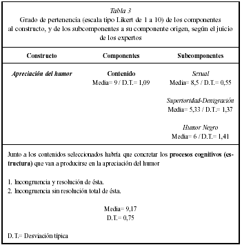 A los expertos se les envió una tabla con la definición semántica de la apreciación del humor. Junto a ésta, se les hacía llegar otra sin las aclaraciones sobre lo que era cada componente, apareciendo sólo las etiquetas de éstos. A los expertos se les pedía que en esta segunda tabla indicasen con un número de 1 (nada pertinente) a 10 (muy pertinente) el grado en el que ellos pensaban que las distintas facetas señaladas como constituyentes de la apreciación del humor realmente lo eran. De igual forma se les solicitaba que indicasen las observaciones que estimasen oportunas sobre la definición planteada, señalando incorrecciones o ampliándola como creyeran adecuado.