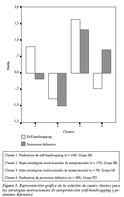 Como puede observarse, porcentajes similares de estudiantes optan por mecanismos de self-handicapping (cluster 1), informan de un uso preferente del pesimismo defensivo (cluster 4) o se caracterizan por no utilizar ninguno de estos mecanismos motivacionales de autoprotección (cluster 2). Por otra parte, hemos encontrado un grupo que integra aproximadamente al 10% de la muestra, caracterizado por un uso elevado tanto de self-handicapping como de pesimismo defensivo (cluster 3).