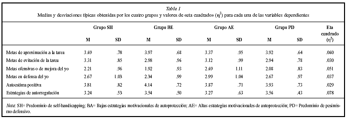 Después de definir cada uno de los grupos en estrategias motivacionales de autoprotección a partir de la solución de cuatro clusters, los resultados del MANOVA indican que no existen diferencias significativas entre los cuatro grupos en autoestima negativa. Como en el resto de variables las diferencias entre los grupos son significativas, vamos a describir a continuación los resultados del ANOVA. Para determinar entre qué medias existen diferencias significativas, utilizamos como prueba de contrastes post hoc la prueba de Scheffé. También presentamos el tamaño del efecto de la variable independiente (tipos de agrupaciones) sobre cada una de las variables dependientes a través de los valores de «eta cuadrado» (η2), lo que nos permite conocer la proporción de la varianza de la variable dependiente explicada por las diferencias entre los grupos.