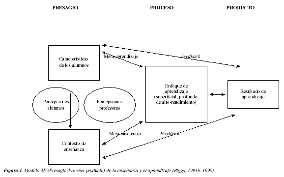 Hace ya algunos años, Dunkin y Bidle (1974) han establecido un modelo que describe el proceso de aprendizaje y el funcionamiento de un aula en tres fases: presagio, proceso y producto. Los factores de presagio comprenden los aspectos contextuales (del alumno y de la enseñanza) previos a la acción educativa en un aula. Estos influyen sobre las variables de proceso, las cuales describen la dinámica de enseñanza-aprendizaje que tiene lugar durante la interacción en clase y de la cual resulta la fase de producto, en muchas ocasiones sinónimo de resultados escolares. Este modelo Presagio-Proceso-Producto (Modelo 3P) fue adoptado por Biggs (1987a; 1993a,b) para representar la perspectiva del alumno en el proceso de enseñanza-aprendizaje.