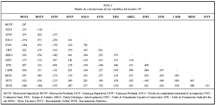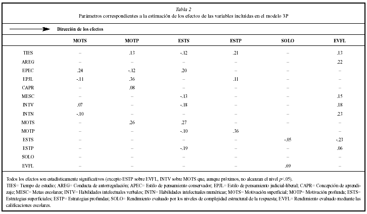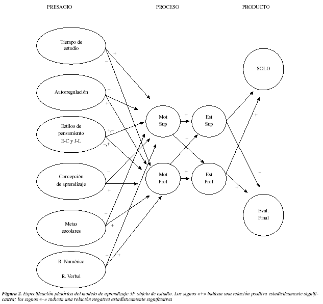 Atendiendo al signo de la relación «causal» entre las variables del modelo hipotetizamos que: (a) el tiempo de estudio influye positiva y significativamente sobre la motivación tanto profunda como superficial; (b) el uso de estrategias de autorregulación influye positiva y significativamente sobre la motivación profunda y negativamente sobre la motivación superficial; (c) el estilo de pensamiento ejecutivo/consevador influye positivamente sobre la motivación superficial mientras que el estilo de pensamiento judicial/liberal lo hace sobre la motivación profunda; (d) una concepción profunda del aprendizaje por parte del estudiante se asociará con una motivación profunda, mientras que una concepción superficial fomentará una motivación superficial; (e) cuanto mayores sean las metas escolares perseguidas por el estudiante mayor será también la motivación profunda, mientras que cuanto menor sean tales metas el estudiante tenderá al desarrollo de una motivación superficial; (f) tanto el razonamiento verbal como las habilidades numéricas estarán asociadas positivamente con los procesos motivacionales (principalmente respecto a la motivación profunda); (g) la motivación superficial determina significativamente una estrategia de estudio y aprendizaje superficial, mientras que una motivación profunda determina una estrategia profunda; (h) el desarrollo de una motivación superficial influye negativamente sobre la adopción de una estrategia profunda, mientras que el desarrollo de una motivación profunda se relaciona negativamente con la adopción de una estrategia superficial; (i) el uso de estrategias de aprendizaje, tanto superficiales como profundas, influye significativamente sobre el resultado del aprendizaje, tanto desde una perspectiva cuantitativa como cualitativa; (k) mientras que la utilización de estrategias profundas lleva a un mejor rendimiento, el uso de estrategias superficiales conduce a un menor rendimiento.