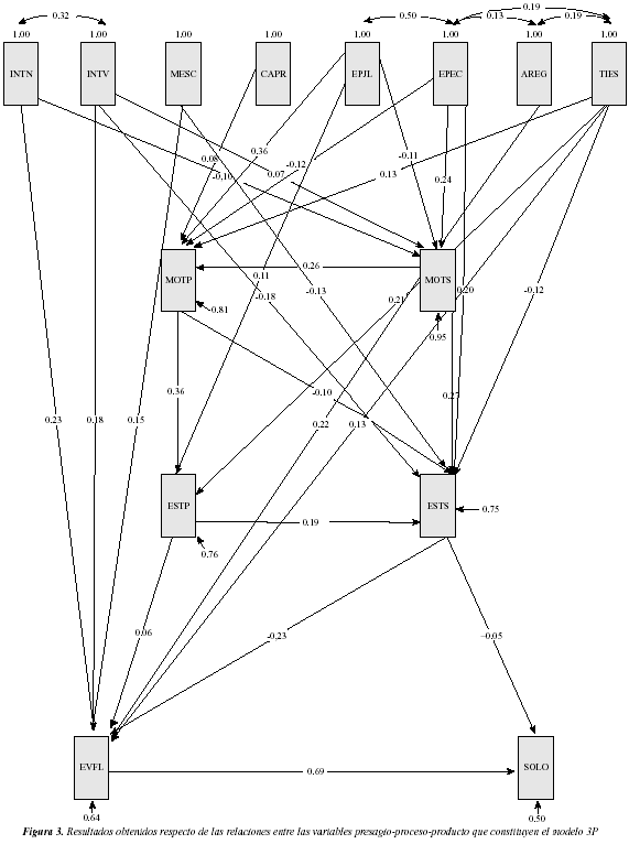 En el diseño del modelo de aprendizaje 3P especificamos las relaciones entre las variables del ámbito de proceso (motivos y estrategias) reflejando el concepto de enfoque de aprendizaje. Los resultados obtenidos confirman las hipótesis planteadas en la medida en que los alumnos de Educación Secundaria optan por estrategias congruentes con su motivación para el estudio. Así, la motivación superficial incide directa y significativamente sobre la variable estrategia superficial (β= 0,27; t= 6,98; p<0,001) y la motivación profunda incide positiva y significativamente sobre la variable estrategia profunda (β= 0,36; t= 9,12; p<0,001). Simultáneamente, también puede ser observado que la motivación profunda influye negativamente sobre la adopción de estrategias de aprendizaje de tipo superficial (β= -0,10; t= -2,33; p<0,05), aunque no encontramos este tipo de relación entre la motivación superficial y el uso de estrategias profundas de aprendizaje. Una relación no especificada inicialmente en el modelo, y sí hallada significativa, es el efecto de la motivación superficial sobre la motivación profunda (β= 0,26; t= 6,67; p<0,001).