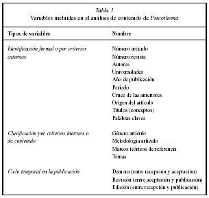 El universo del estudio la componen los números de la revista Psicothema en sus 15 volúmenes, desde 1989 a 2003, ambos incluidos, lo que representan 1.134 artículos. De ellos, la muestra de análisis la representan 171 artículos, es decir, el 15,08% que son clasificados como de psicología del desarrollo y de la educación, según el «sistema de categorías temáticas exhaustivos y mutuamente excluyentes» aplicado y previamente desarrollado en Sánchez y García (2001). Esta selección se justifica puesto que Psicothema es una revista científica generalista de Psicología, lo que, dados los objetivos de la línea de investigación y del estudio específico, exigía centrarse en contenidos específicos.