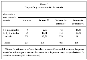 De forma global, han colaborado 337 autores en 465 colaboraciones, en los 171 artículos con contenido de psicología del desarrollo y de la educación (ver Tabla 2). La productividad científica, como la que se da en la literatura, el arte, el cine u otras actividades artesanales, técnicas o culturales o científicas, tiene cierta concentración en torno a unos pocos autores que publican mucho, además de una concreta dispersión y distribución entre muchos autores que publican uno o dos artículos (García et al., 2002; 2004). Es posible analizar la relación entre productividad y cobertura y dispersión autoral o número de autores distintos que publican en una disciplina, y de la intensidad o mayor concentración de la productividad en ciertos autores.