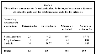 Han participado 52 universidades con 464 colaboraciones, de las cuales 444 son colaboraciones españolas y 20 extranjeras, y de ellas, 8 latinoamericanas. Si bien son diversas las participantes, algunas copan una gran producción, como la de Oviedo, con 96, A Coruña con 31, Valencia con 28, Autónoma de Madrid con 22, la Complutense, La Laguna y Málaga con 20 cada una, Granada 16, etc. Del mismo modo que se podía detectar la dispersión y concentración autoral, para el caso de las universidades, esta concentración aún es mayor. Al valorar de forma conjunta la concentración autoral y de universidades, se obtiene que un número reducido de autores o equipos de investigación con aportaciones numerosas acumulan la mayoría de las aportaciones que aparecen en las universidades e instituciones (Tabla 3).