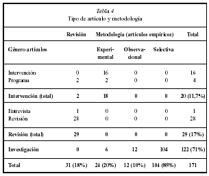 Como puede verse en la tabla 4, el tipo de artículos predominante es el de investigación empírica (71%), si bien hay un cierto porcentaje relevante de intervención (11,7%) y aún mayor de revisión (17%). En cuanto a la metodología, hay un predominio de la selectiva (85%) sobre la experimental (20%) y sobre la observacional (10%).