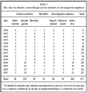 Los datos correspondientes a la relación entre el año de publicación, el tipo de trabajo y la metodología usada se encuentran en la tabla 5. En cuanto al tipo o género del artículo, como podemos observar, existe un dominio absoluto de los estudios de investigación (n= 122) frente a los de intervención (n= 20) y a los de revisión (n= 29). También debe ser mencionado que la mayoría de los estudios de revisión han sido publicados en los primeros años, cuando las normas de Psicothema no limitaban su publicación. En cuanto a la metodología de investigación, un elevado porcentaje de los estudios usan una metodología selectiva (n= 104), siendo menor el número de trabajos con diseños experimentales (n= 24) o de carácter observacional (n= 12).