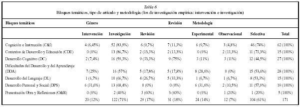En cuanto al tipo de trabajo (en número de artículos), las intervenciones, aunque escasas, aparecen sobre todo en el bloque de DDA, en el de DPS y en el de C&I. Las revisiones, en DC, C&I y en DL y DDA. Y las investigaciones empíricas (incluyendo las intervenciones empíricas) son predominantes en C&I (por otra parte, el más frecuente) y se distribuyen en todos los bloques temáticos. Por otra parte, en cuanto a metodología, es predominante la selectiva para la mayoría de los bloques, excepto para el de DDA y DPS que es la experimental (no olvidemos que las intervenciones empíricas son básicamente estudios experimentales).