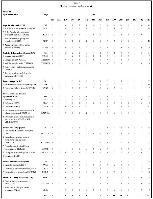 Cuando se considera la distribución por años (ver Tabla 7), el bloque de C&I se da más en los últimos años, con un aumento importante en el 2000. Igualmente, en varios bloques temáticos, se produce un aumento en los últimos años, no teniendo en los primeros ejemplares, como CDE, DC o DPS, e, incluso, en parte en DDA. Podríamos decir, que se da una tendencia a incluir más diversidad de bloques temáticos en los últimos años, además del más general de C&I (más esperable como revista generalista de Psicología), lo que indica que está siendo la revista de elección de autores de todos los bloques temáticos de psicología del desarrollo y de la educación. La escasez de artículos sobre O&R es esperable, y era más habitual en los primeros años de implantación de la Psicología en nuestro país.